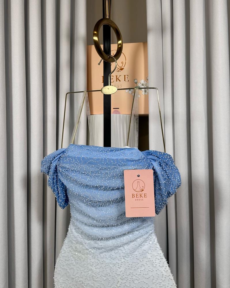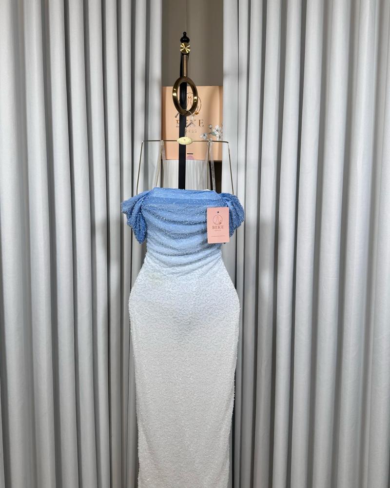 يتميز بتدرج لوني هادئ يبدأ من الأزرق السماوي الفاتح في الجزء العلوي وينساب تدريجياً إلى الأبيض الناعم، ليمنح إطلالة راقية ومشرقة. القماش مطرز بلمسات ناعمة تزيد من فخامته، وتصميمه الضيق يبرز جمال القوام ويجعله خيارًا مثالياً للسهرات والمناسبات الخاصة