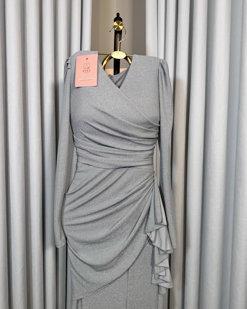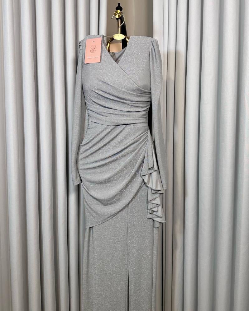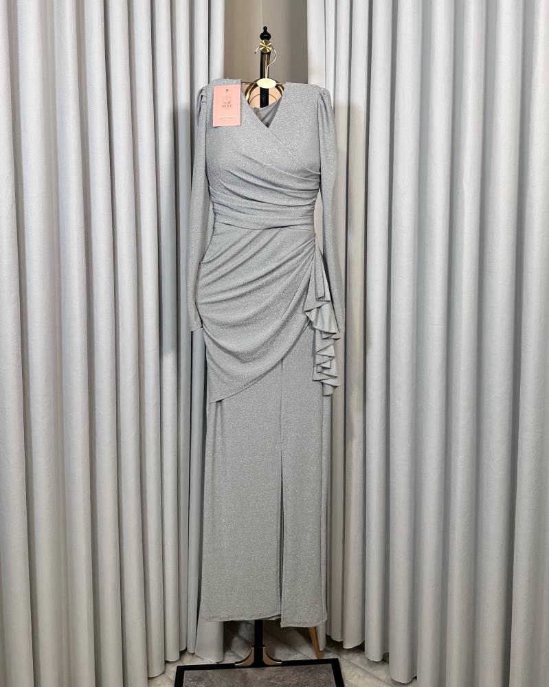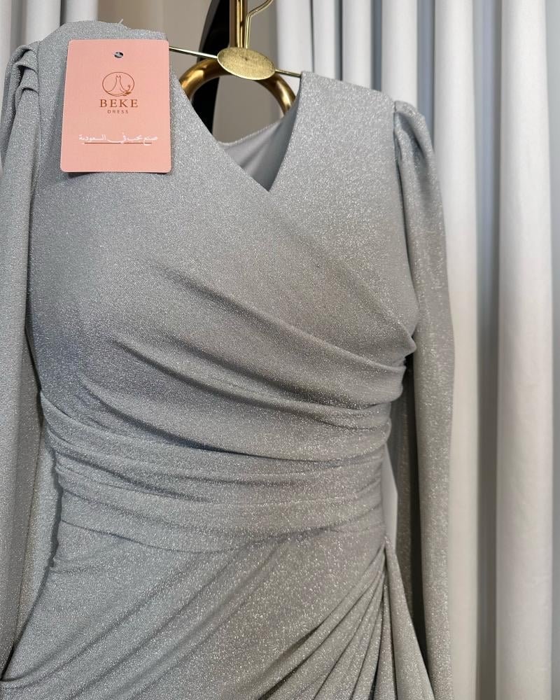 فستان باللون الرمادي اللامع بتصميم طويل،