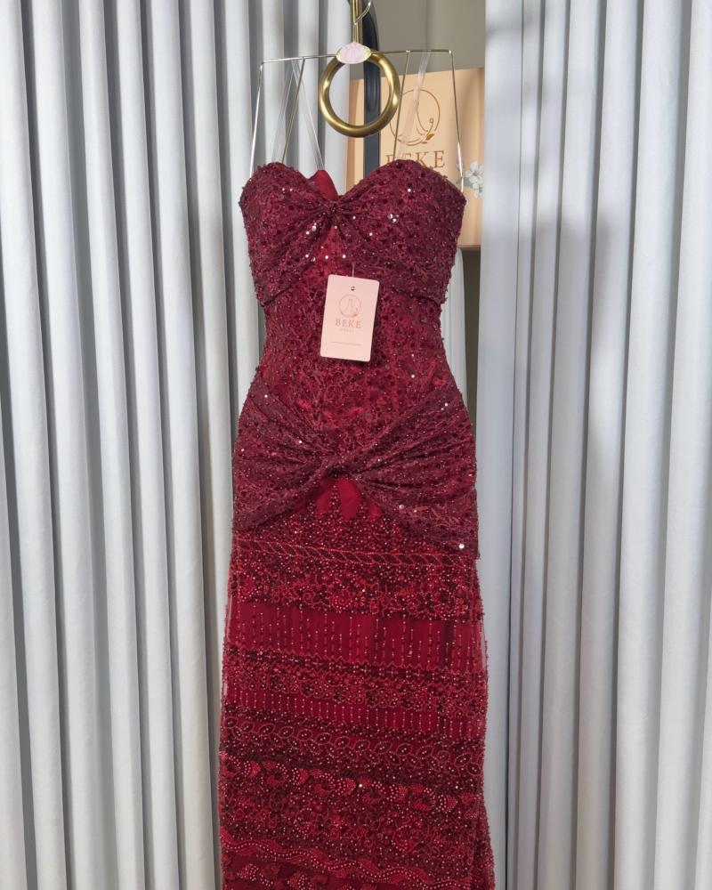 فستان سهرة أنيق باللون الأحمر البوردو،