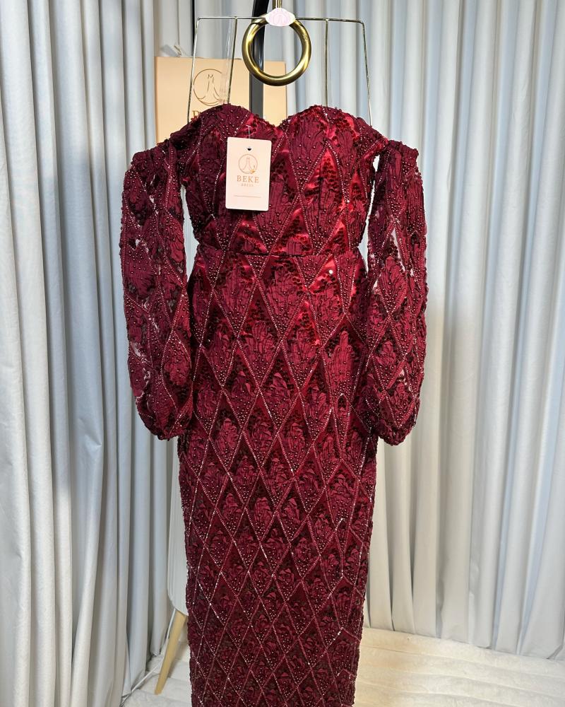 يأتي بقصة ضيقة تبرز جمال القوام، مع صدر مكشوف (أوف شولدر) وأكمام خارجية واسعة تعطي لمسة درامية راقية. الأكمام غير متصلة بالكتف، ما يضيف طابعاً عصرياً ومميزاً للتصميم.