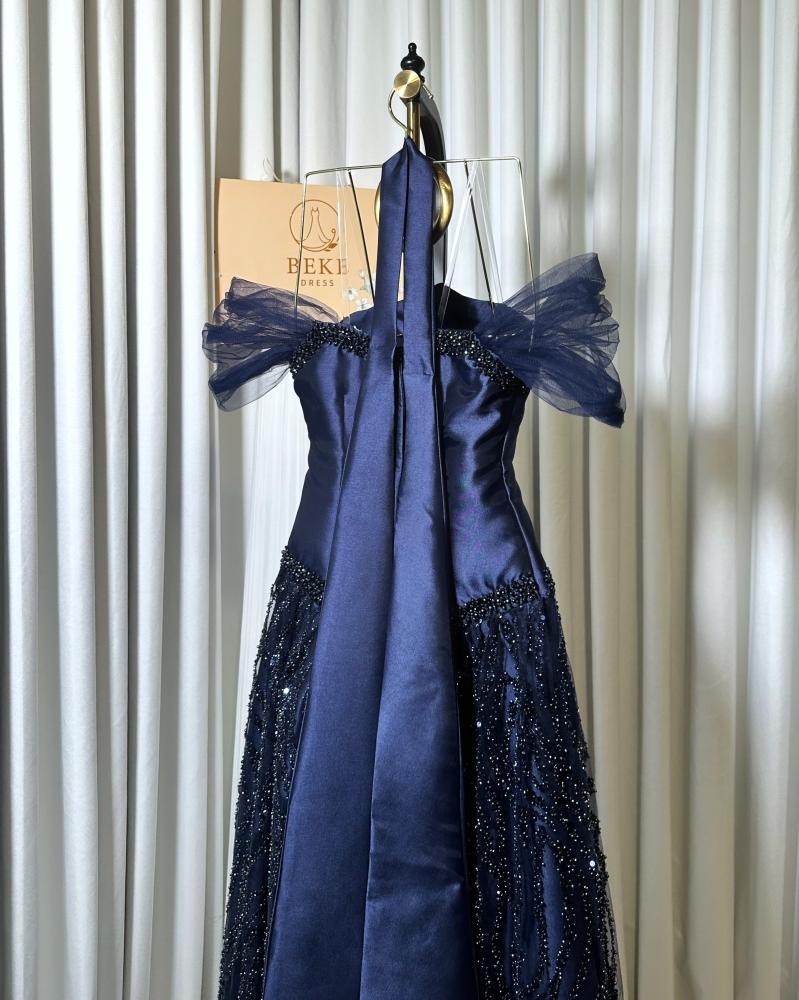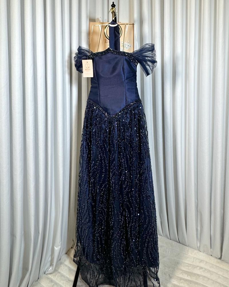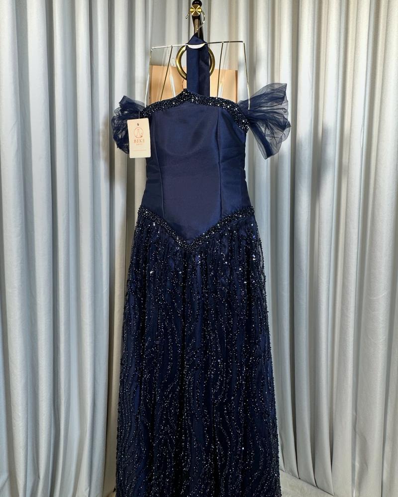 فستان أنيق باللون الكحلي الداكن مصمم بقصة ناعمة تبرز القوام. يأتي الجزء العلوي بقماش لامع بملمس ناعم وقصة ضيقة مع فتحة صدر مستقيمة وأكمام قصيرة منفوشة مصنوعة من التول الشفاف، تضيف لمسة حالمة وأنثوية. محيط الصدر مزين بتطريز دقيق من الخرز الأسود اللامع الموزع بكثافة.