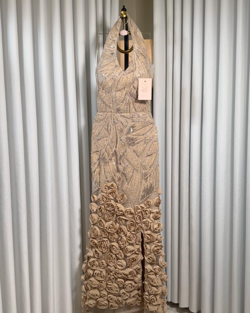 مع ياقة هالتر مفتوحة من الأمام تُبرز منطقة الصدر بأسلوب أنثوي راقٍ. الجزء العلوي مطرّز بالكامل بتطريز هندسي لامع من الخرز والترتر اللامع الذي يعكس الإضاءة ويمنح الفستان لمسة براقة ساحرة.