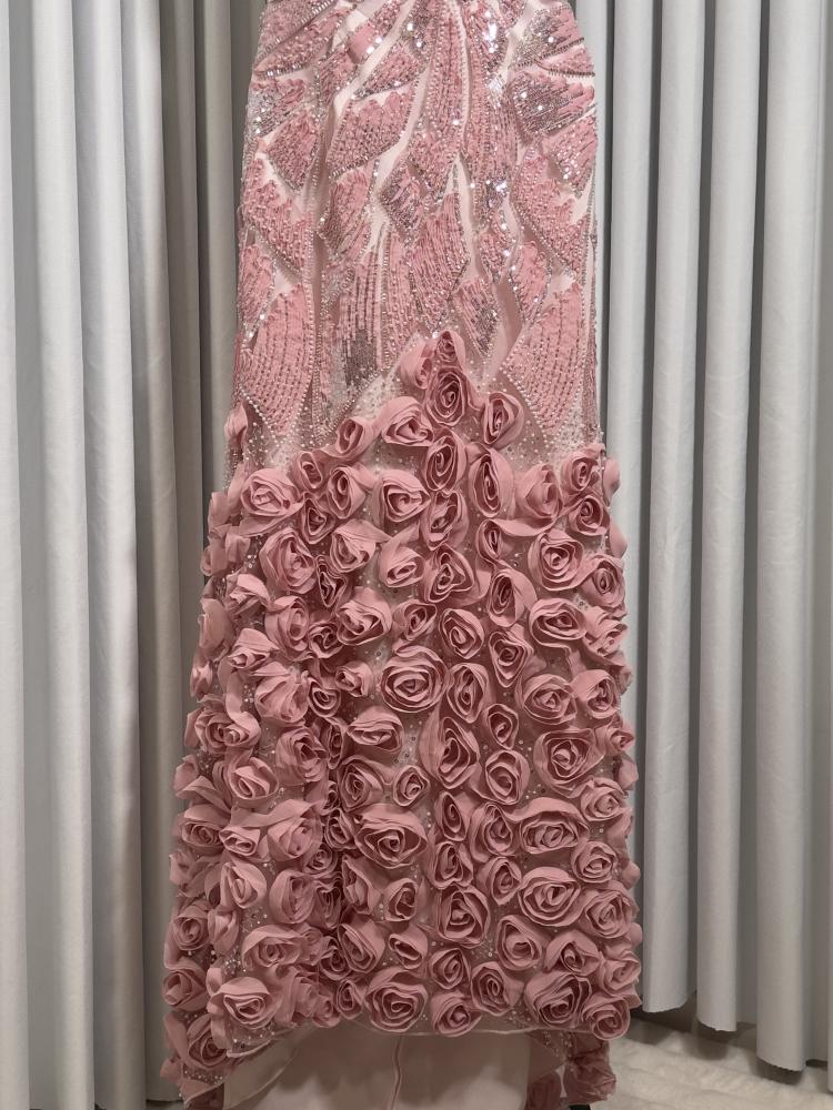 أما الجزء السفلي فيتميز بتصميم مذهل من زهور ثلاثية الأبعاد مصنوعة بعناية من القماش لتمنح الفستان طابعاً رومانسياً فريداً من نوعه. القصة الضيقة تمنحك مظهراً أنثوياً راقياً، مثالي للمناسبات الراقية وحفلات السهرة.